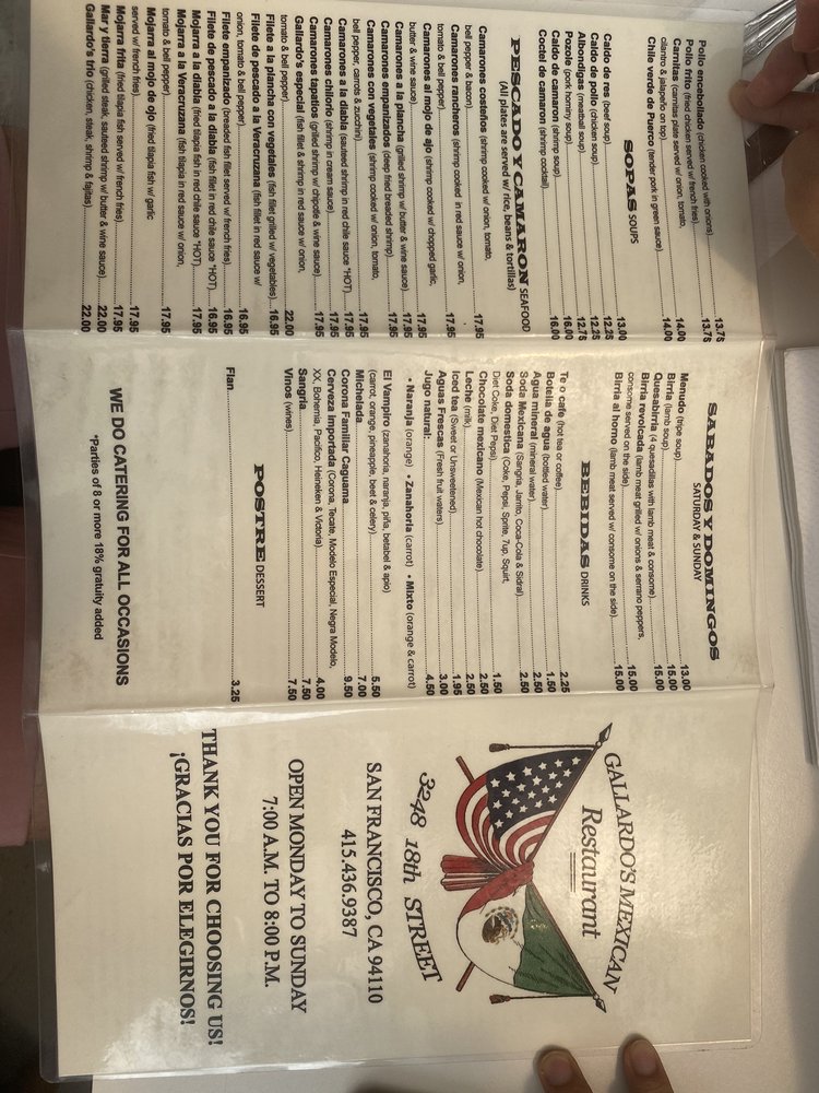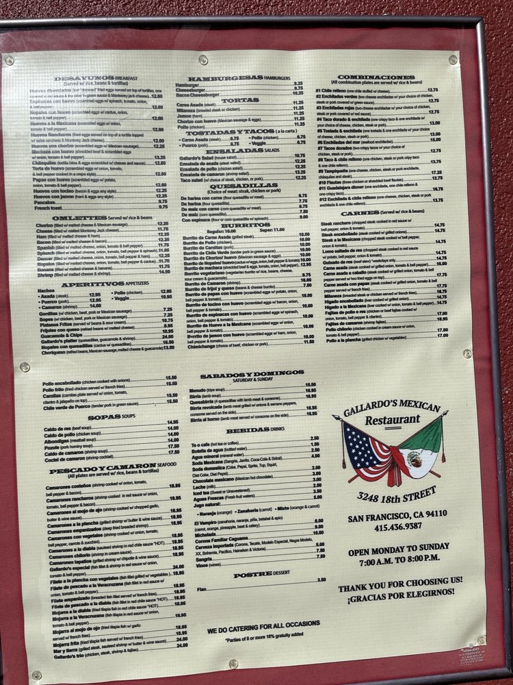 With a Latinx-owned establishment in the heart of San Francisco's Mission district, Gallardos Mexican Restaurant offers a delightful blend of authentic Mexican flavors. Their menu caters to breakfast and brunch lovers, featuring dishes like Menudo, Pazole, Burrito Vegetariano, and Guadalajara Dinner. Customers rave about the friendly service and prompt attention from the staff. The outdoor seating area adds to the charm of this casual dining spot, perfect for groups and families. Some stand-out dishes include their flavorful Chile Relleno, fresh-made tortillas, and the mouthwatering beef milianesa. While the restaurant only accepts cash, an ATM is available on-site for convenience. Whether you're craving a traditional Mexican breakfast or a hearty lunch, Gallardos promises a satisfying dining experience that keeps customers coming back for more.